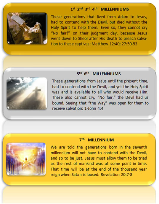 As for those living in the seventh millennium, they will have nothing to complain about as far as salvation is concerned or otherwise. This is because they will have had one thousand protected years to move into perfection and be "changed in the twinkling of an eye." Of course for the saints that finish the work of salvation by redeeming the time (those who will be already redeemed), Satan's last ditch attempt to deceive them at the end of the thousand years will be to no avail. Nevertheless, it says Satan will be able to gather his ranks from outside both "the beloved city" and "the camp of the saints about": Revelation 20:9. Revelation 20 puts it this way.